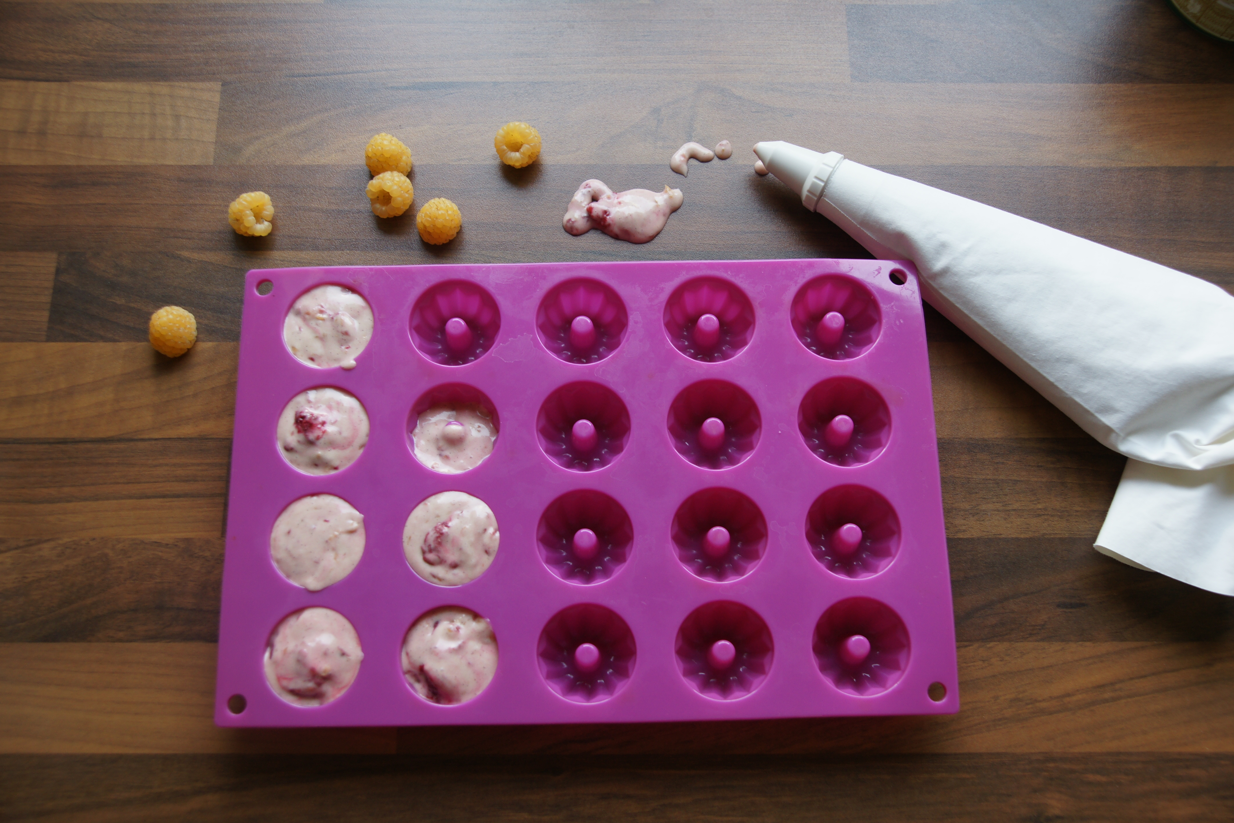 Dann geht eigentlich alles ganz schnell: Nacheinander das Ei, die steif geschlagene Sahne und das Mehl unterheben. Zum Schluss dann die Himbeeren noch mit etwas Mehl vermischen und ab damit unter den Teig. Ist das geschafft geht’s auch schon ab ins Förmchen;)