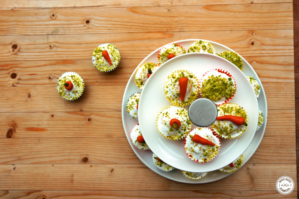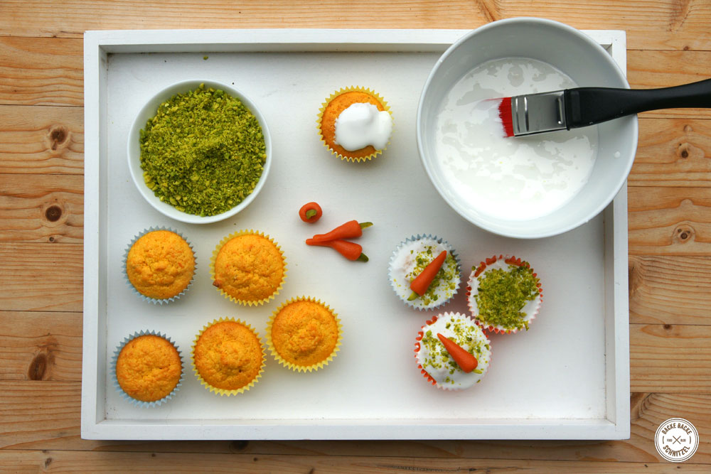 Muffins einstreichen, mit Pistazien bestreuen und eine Karotte möglichst ästhetisch darauf drapieren – fertig.