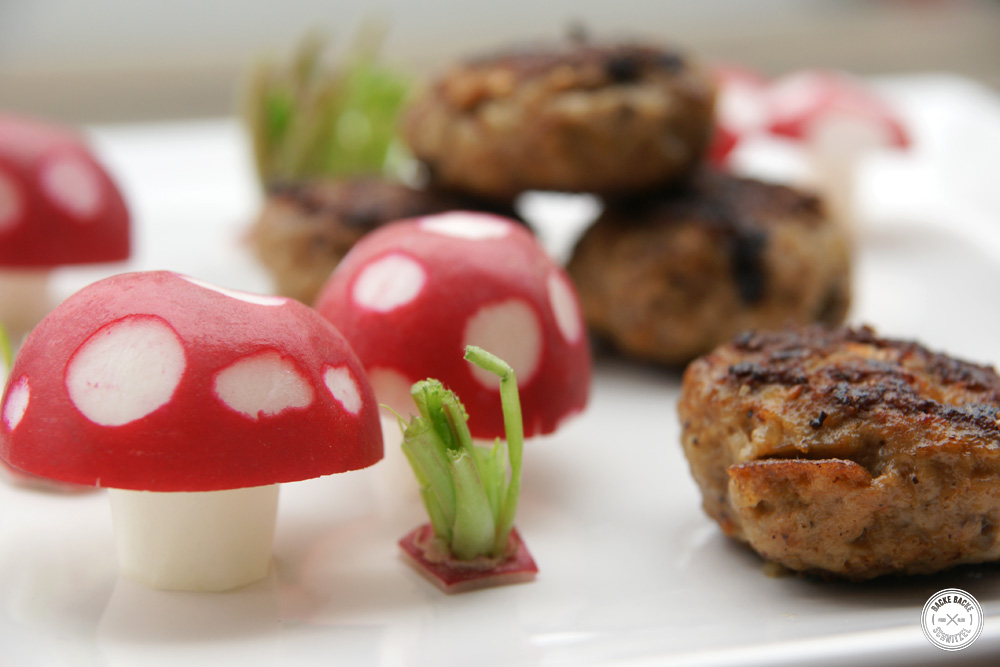 Öl in einer Pfanne erhitzen und die Fleischpflanzerl bei mittlerer Hitze nach und nach von beiden Seiten braten. Ab und zu schneide ich dann immer eines an und schau nach, ob sie fertig sind. Dann aus der Pfanne nehmen und entweder gleich warm – am besten mit Kartoffelsalat – oder später kalt zur Brotzeit essen. Oder natürlich beides, werden ja ein paar. Wer mag kann sie natürlich auch mit ein paar Radieschen-Fliegenpilzen anrichten, dann werden sie auch gleich etwas fotogener…