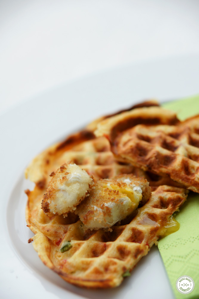 Derweil je ein Wachtelei in eine kleine Tasse, zum Beispiel eine Espressotasse, aufschlagen. In einem Topf 1,5 l Wasser erhitzen und Essig und Salz dazugeben. Das ganze einmal aufkochen, dann bei mittlerer Hitze warm halten. Das Ei langsam in den Topf geben und mit zwei Löffeln schnell das Eiweiß immer wieder um das Eigelb schlagen. Da sie ja sehr klein sind, sind sie relativ schnell fertig, denn das Eigelb sollte noch flüssig sein. Die Eier aus dem Wasser nehmen und gleich in Semmelbröseln wälzen. Das kann dann so oft wiederholt werden, wie man will & wie viele man eben braucht. Öl in einer Pfanne erhitzen und die pochierten, panierten Eier noch ganz kurz goldbraun anbraten. Dann auf den Waffeln platzieren und schon kann serviert werden.