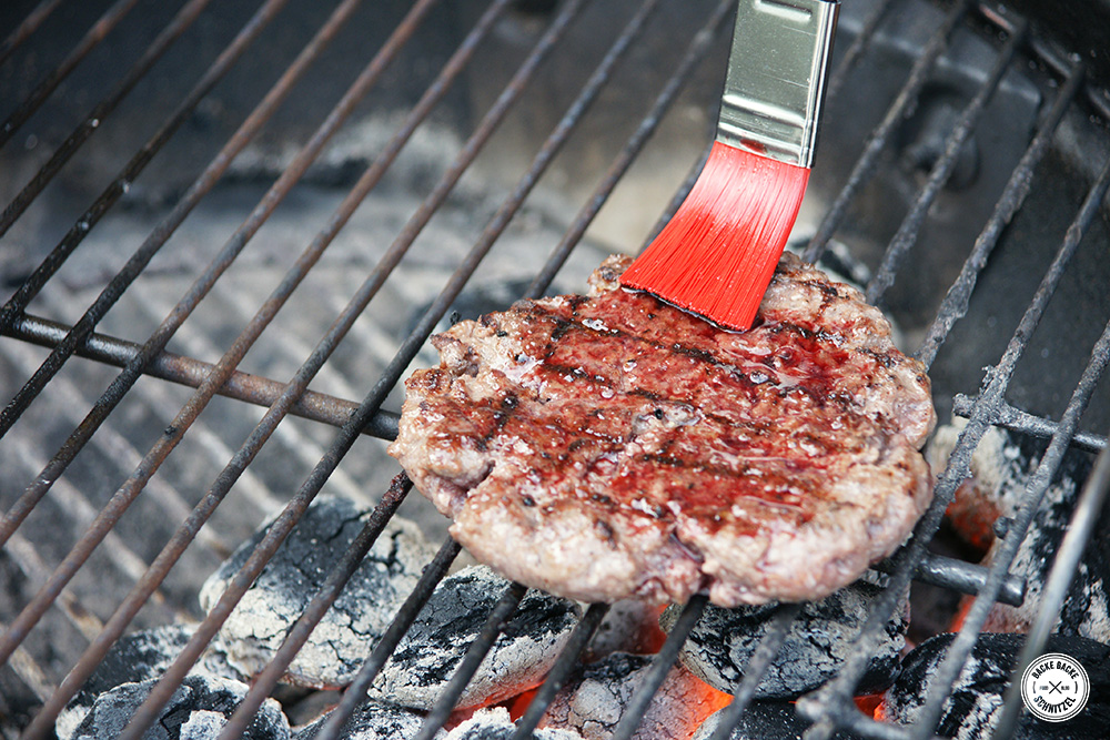 Hackfleisch mit Salz und Pfeffer würzen und 4 EL des Rotwein-Suds dazugeben. Alles gut vermischen, kneten und in 6 Teile teilen. Diese zuerst zu Bällen formen und dann einfach platt drücken. Das Hackfleisch sollte am Ende einen größeren Durchmesser haben als das Brot, da es beim Grillen ja noch eingeht.