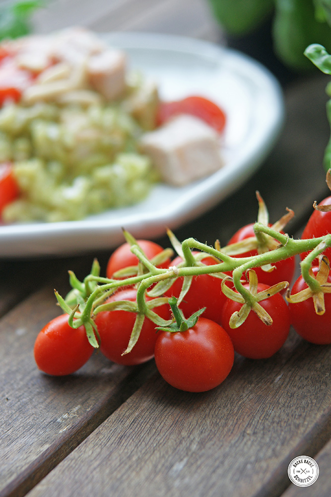 Mit ein paar halbierten Kirschtomaten und gerösteten Pinienkernen garnieren – fertig.